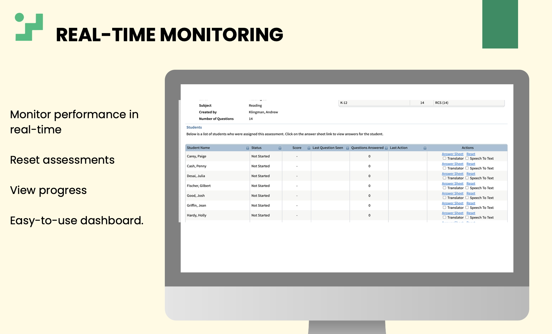 - Live Monitoring & Reset: Educators can monitor progress in real time, identifying students who require assistance. If a session is disrupted or a student makes errors, tests can be reset individually or in groups to ensure valid data collection.